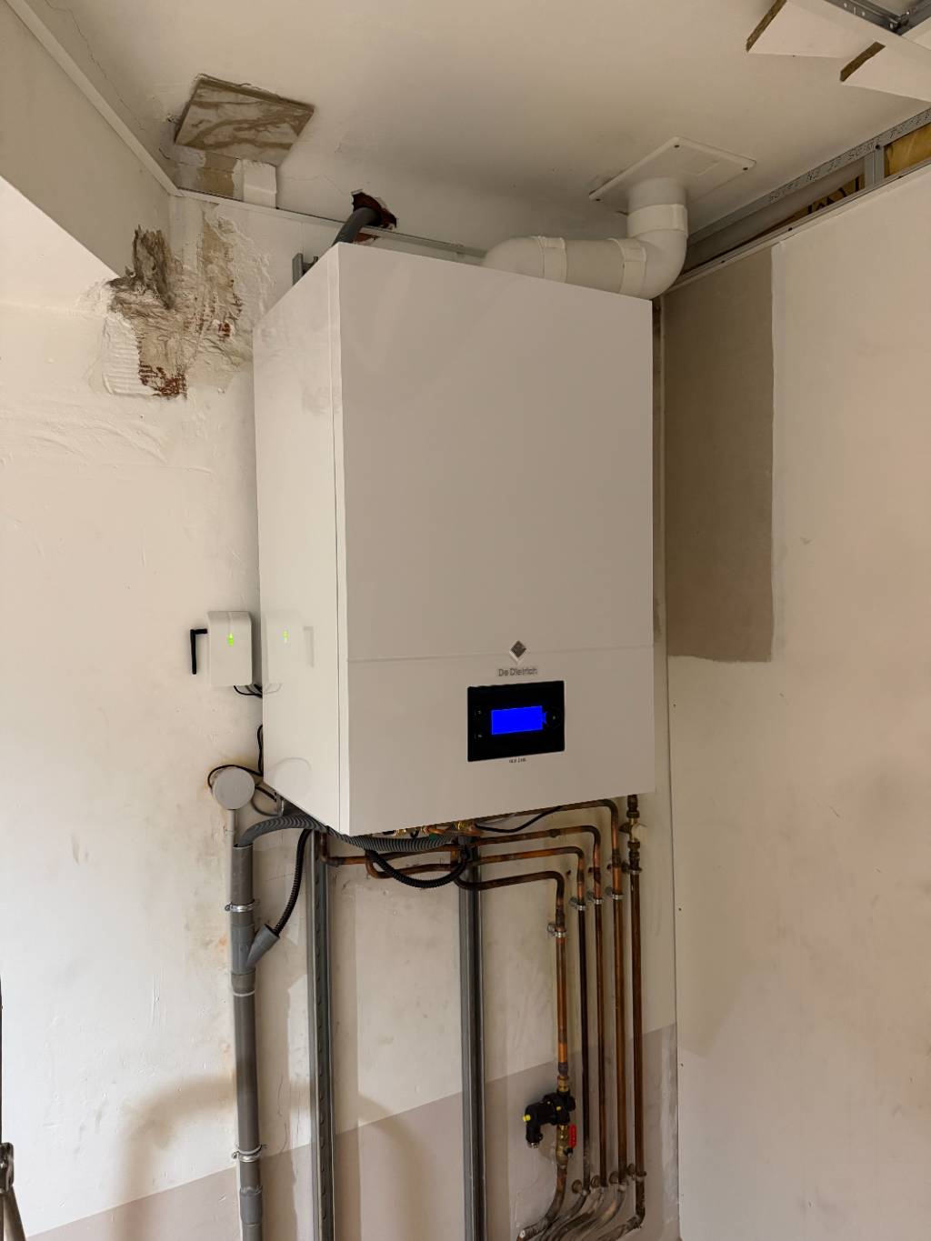 Notre équipe de techniciens (RGE Qualigaz) a remplacé une chaudière gaz SAUNIER DUVAL par une chaudière gaz De Dietrich, dans un appartement au RDC des années 20 à Tarare dans le Rhône (69).
