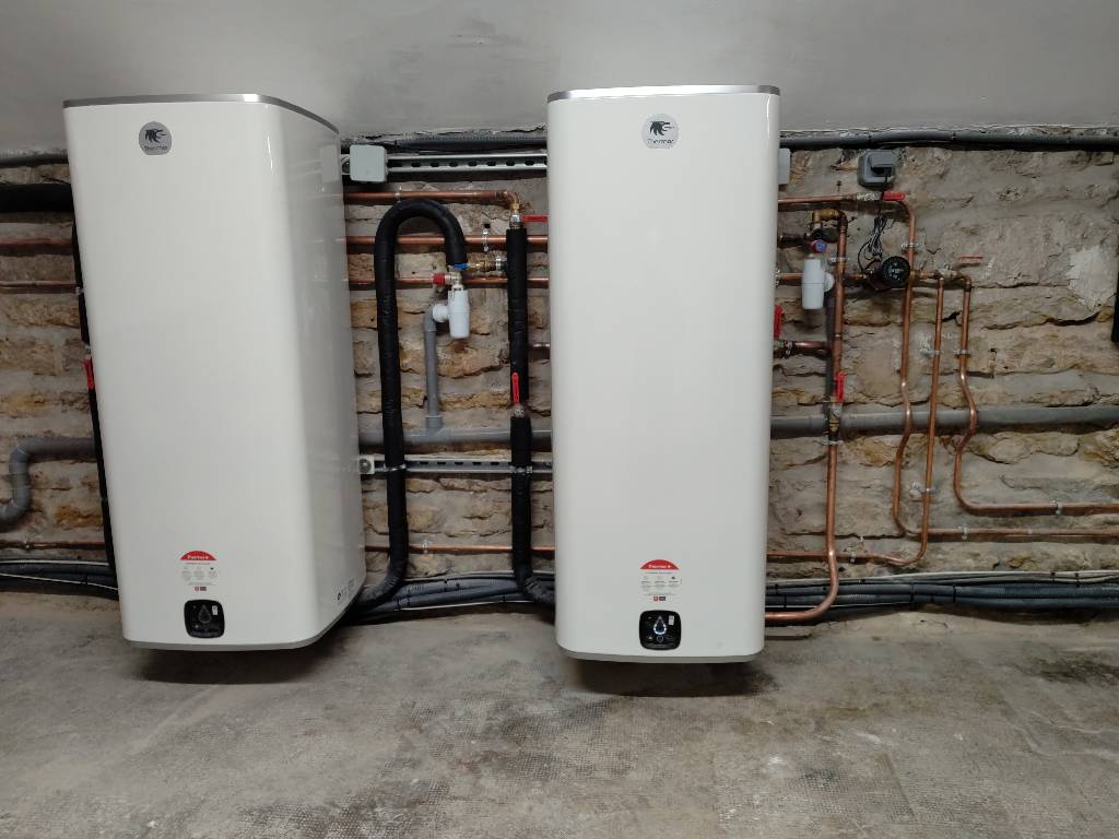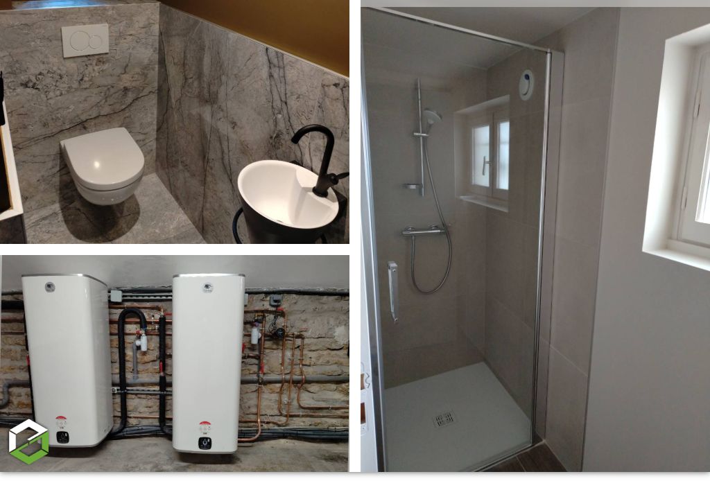 Après démontage et évacuation en déchèterie des installations non conservées, nos équipes ont réalisé l'ensemble de la distribution d'eau froide et d'eau chaude en cuivre et en PER, les évacuations en tube PVC , les appareils sanitaire (GEBERIT, DECOTEC, AQUABELLA), la production d'eau chaude sanitaire avec des cumulus plat THERMOR haute performance énergétique, et un bouclage d'eau chaude sanitaire assuré par un circulateur GRUNDFOS.